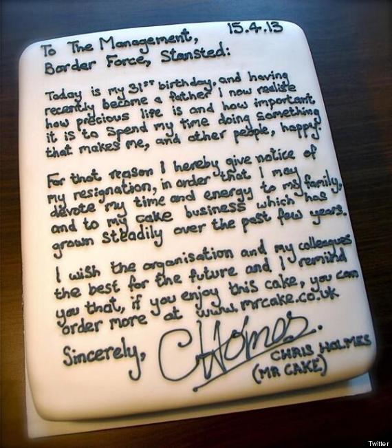 Short Description :15.4.13To the Management Border Force, StanstedToday is my 31st birthday, and having recently become a father I now realise how precious life is and how important it is to spend my time doing something that makes me, and other people happy.For that reason I hereby give notice of my resignation, in order that I may devote my time and energy to my family and to my cake business which has grown steadily over the past few years.I wish the organisation and my colleagues the best for the future and I remind you that, if you enjoy this cake, you can order more at www.mrcake.co.ukSincerely,Chris Holmes (Mr Cake)